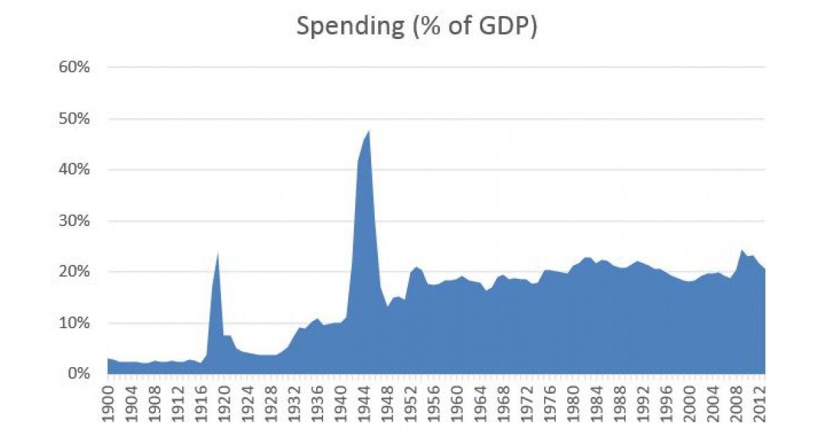Below are two graphs: one of government spending in terms of dollars and the other relative to GDP. Not much can be extracted from the dollar graph except that more “dollars” are spent every year. It looks very shocking! More information can be extracted from the relative to GDP graph. It is pretty easy to see when World I and World II happened. Even the Korean War can be seen. We can also see how spending ramped up under FDR and stayed up afterward primarily because of social programs and maintaining a strong military. We can also see that spending has hovered around 20% of GDP since Korean War.