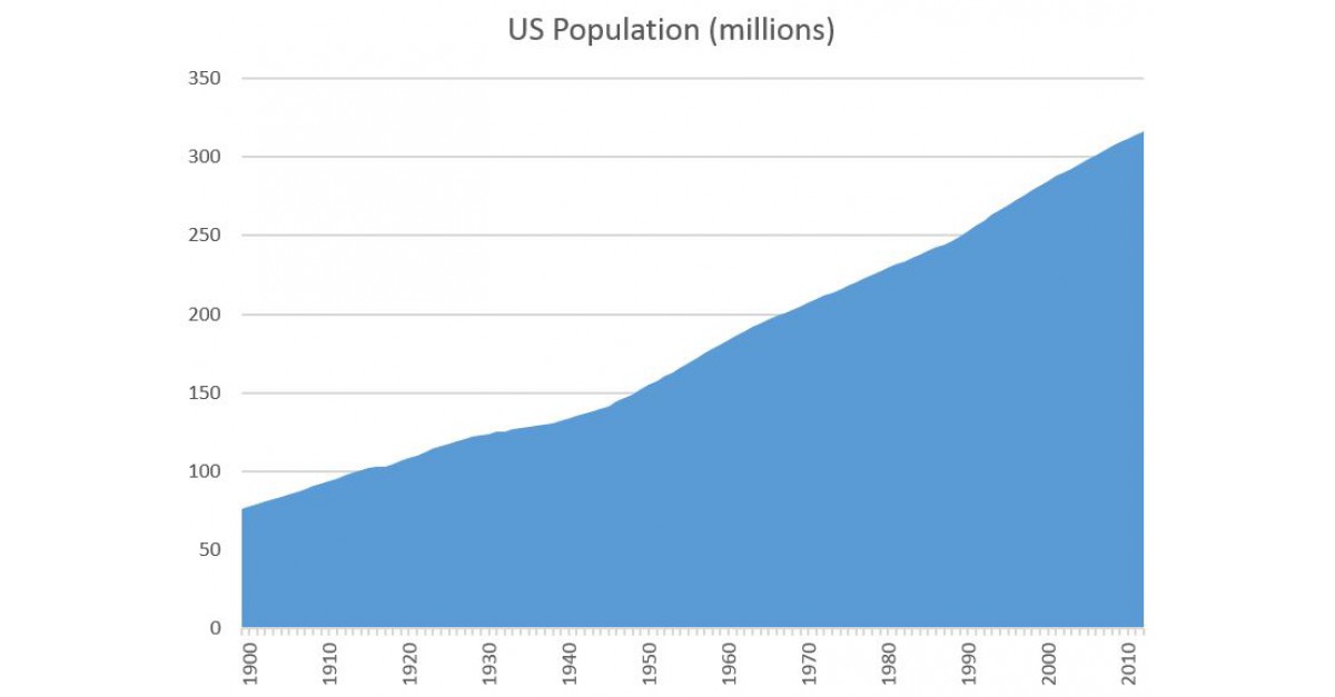 It is important to keep in mind that population growth and inflation make numbers grow pretty rapidly. One often hears how bad the current president is for spending so much more than the previous president. This will naturally happen with population growth and inflation. A lot of data expressed in dollar terms is going to take on the form of the following graphs and really don’t tell you much.